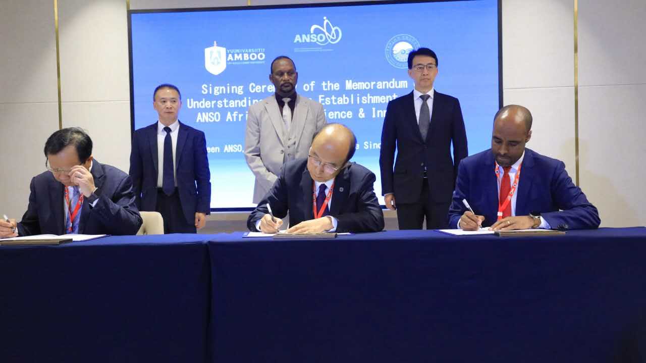 9月27日,“一带一路”国际科学组织联盟(ANSO)秘书长刘卫东、埃塞俄比亚安博大学(AU)校长巴伊萨·莱塔·达诺(Bayisa Leta Danno)与中国科学院中-非联合研究中心(SAJOREC, CAS)主任王青锋在埃塞俄比亚亚的斯亚贝巴签署《合作备忘录》,正式宣布成立ANSO非洲科学与创新中心(AAHSI)。中国驻埃塞俄比亚大使馆公参刘晓光、驻非盟使团参赞何开辉、埃塞俄比亚教育部国务副部长科拉·图舒内(Kora Tushune)出席并见证签约,共同为中心揭牌。